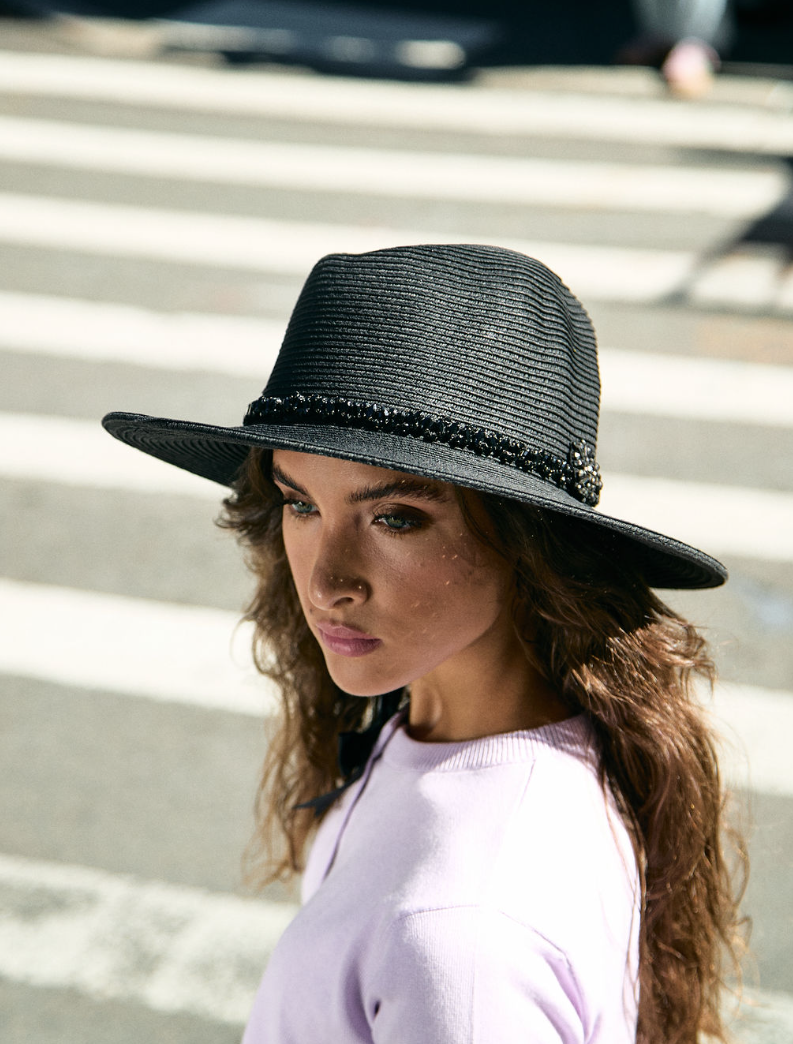 Summer Straw Hat w. Scattered Crystals - Natural with Blue Trim
