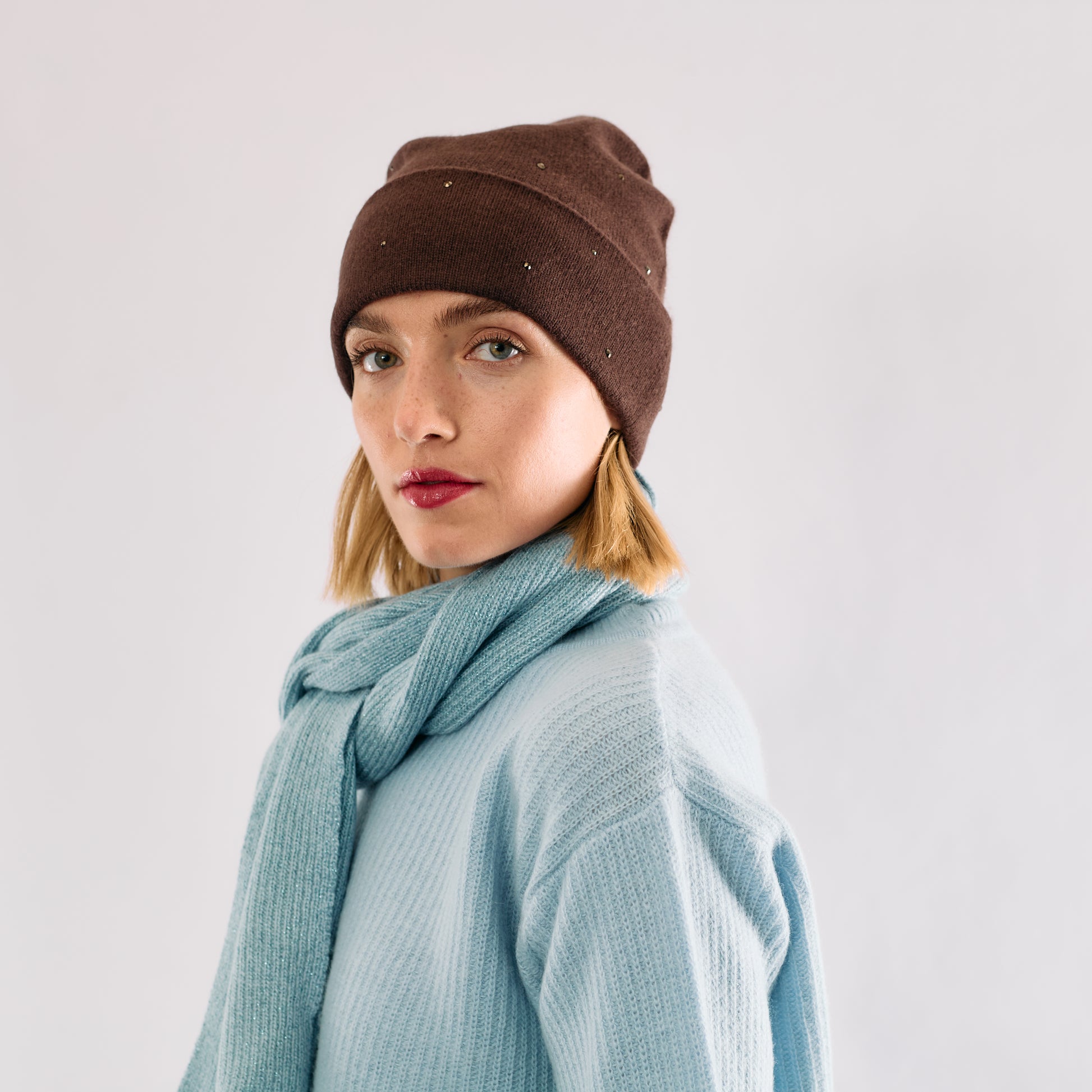 Cashmere Jersey Knit Cuffed Beanie with Scattered Monochromatic Crystals- Chocolate Brown