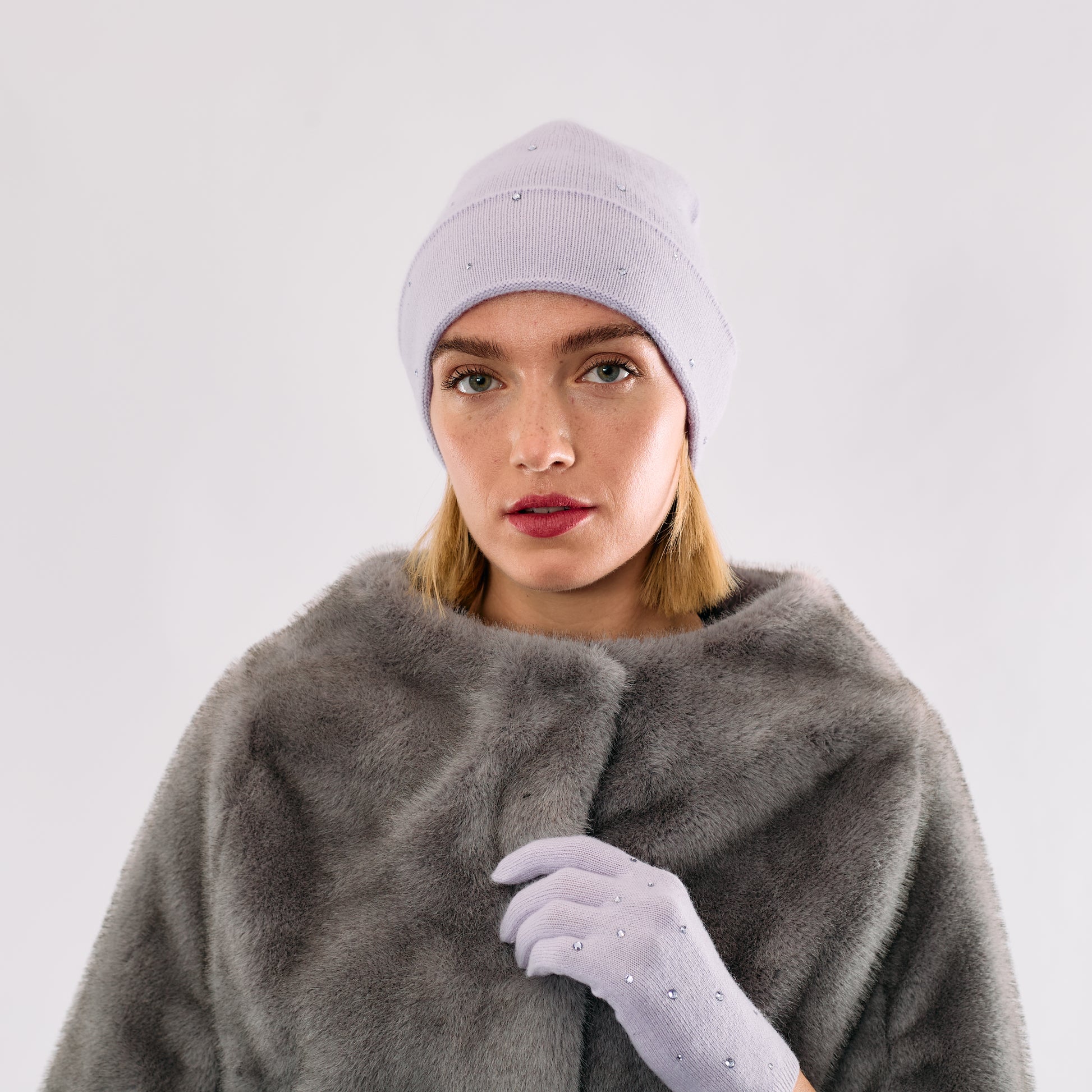 Cashmere Jersey Knit Cuffed Beanie with Scattered Monochromatic Crystals- French Lavender
